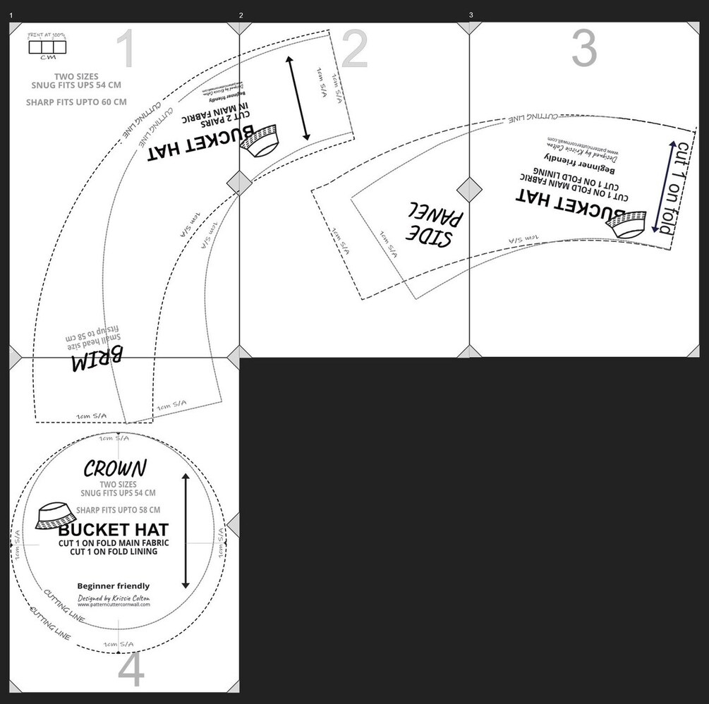 Designed with precision, the pattern incorporates a 1 cm seam for a polished finish using the bag-out method, expertly demonstrated in an accompanying video. The strategic use of two fabrics not only enhances the hat's structure but also allows for upcycling with materials like denim.